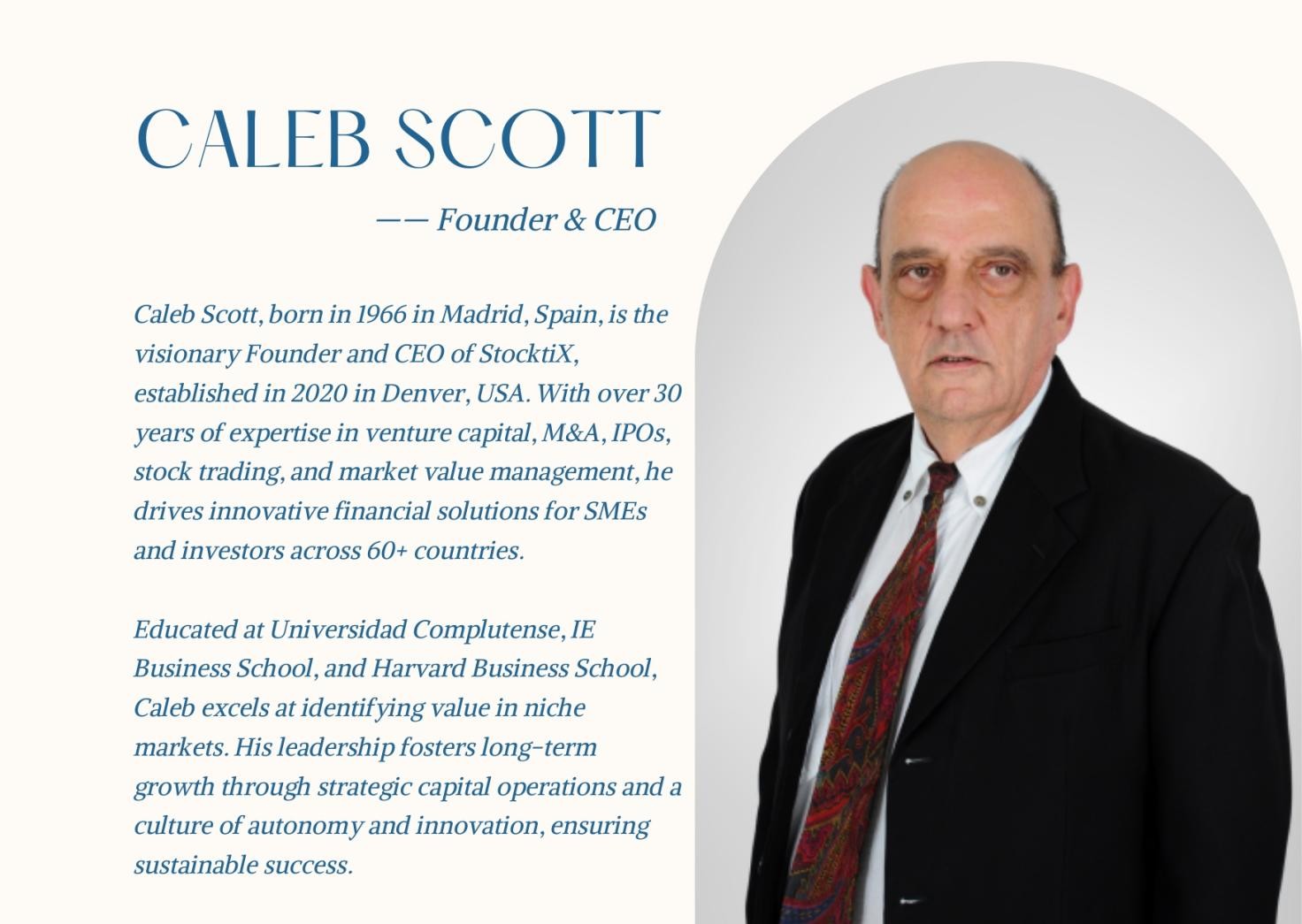 Caleb Scott, StocktiX’s founder and CEO, is the core driving force and visionary behind the company’s success. Born in 1966 in Madrid, Spain, Mr. Scott brings over 30 years of experience in cross-border capital operations. Early in his career, he delved deeply into Europe’s retail supply chain and regional investment sectors, building a strong foundation in financial analysis, structured financing, and market insights. He excels at uncovering hidden value in niche markets and non-mainstream assets, driving business growth from small to large and weak to strong through flexible and efficient capital pathways. Starting in the 1990s, Scott held operational and financial leadership roles in European companies, spearheading cost controls, cash flow optimization, and supply chain financing designs.